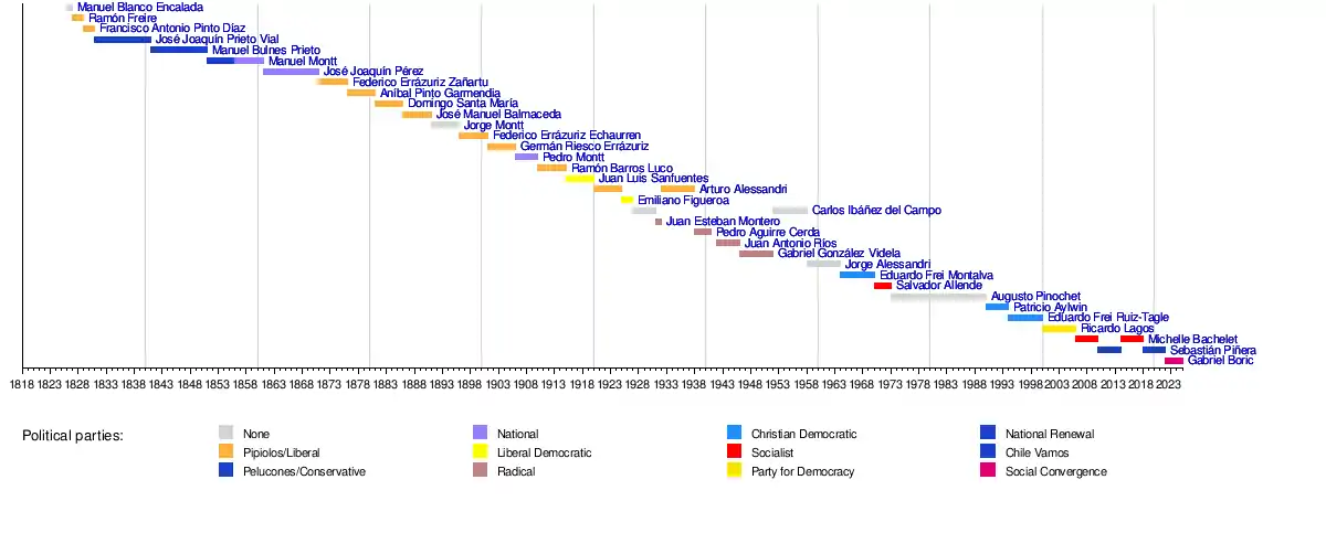 This article contains a list of presidents of Chile from the establishment of the first government junta in 1810, at the beginning of the Chilean War of Independence, to the present day.