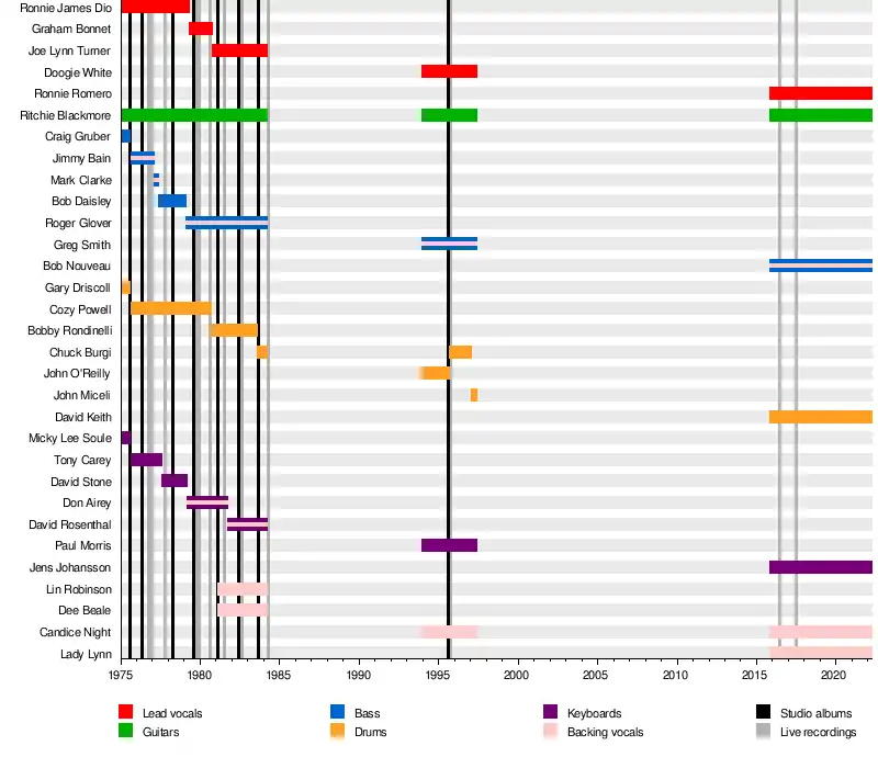 | Lead vocals | Ronnie James Dio | Graham Bonnet | Joe Lynn Turner | Doogie White | |||||||||||||||