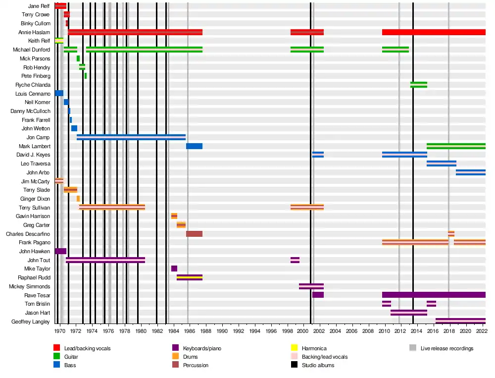 By October 2010, Brislin had been replaced by Jason Hart.[25] On 20 November 2012, Dunford died after suffering a cerebral hemorrhage.[26] Despite the loss of a central member, Haslam assured that Renaissance would continue, and the following February it was announced that Ryche Chlanda would take over as the band's guitarist.[27] Grandine il vento, a new studio album recorded prior to Dunford's death, was released a few months later.[28] In 2015, Chlanda, Keyes and Hart were replaced by Mark Lambert, Leo Traversa and Tom Brislin, respectively.[29] The following year, Brislin was replaced again by Geoffrey Langley.[30] Charles Descarfino replaced Pagano in 2017 for an orchestral tour,[31] although by 2018 the drummer had returned to the band.[32] Later in the year, John Arbo replaced Traversa on bass.[23]