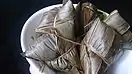 The sweet version is eaten with peanut powder; the leaf used to wrap the rice is fatak (Panicum maximum) leaf.[12] |