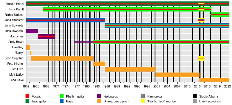 In April 2000, Rich retired from the group after 15 years citing family commitments,[19] and was replaced with Matt Letley. With Letley, the group would release six studio albums starting with Heavy Traffic (2002) and ending with Bula Quo! (2013), Bula Quo being a soundtrack album for the feature film of the same name, an adventure comedy starring Rossi and Parfitt. Letley would, in turn, announce his own retirement after 13 years in 2013, and would be replaced by current drummer Leon Cave.[20] Between 2000 and 2002, Bown took a break from touring for personal reasons, and would be covered by Paul Hirsh of Voyager.[21]