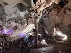 Snezhanka is situated in the western Rhodope Mountains in the valley of Stara Reka river at some 5 km from the town of Peshtera, Pazardzhik Province. The cave is rich in stalactites, stalagmites, draperies and sinter lakes. Listed in the 100 Tourist Sites of Bulgaria under No. 37.[27] | 368 m[28] | ![]() |