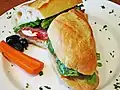 Chickpea salad is a vegan sandwich filling with a texture similar to tuna salad. Chickpea salad consists of mashed up chickpeas, onions, and other seasonings. Some versions also include tuna.[11] |
