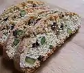 | Zwieback | ![]() | A type of crisp, sweetened bread, made with eggs and baked twice. It is sliced before it is baked a second time, which produces crisp, brittle slices that closely resemble melba toast.[17] The name comes from German zwei ("two") or zwie ("twi-"), and backen, meaning "to bake".[18] Zwieback hence literally translates to "twice-baked". Zwieback is commonly used to feed teething children.[17] | |