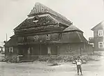1750 - 1941 | The synagogue building was a wooden structure built on a stone foundation. The walls of were cut from edged logs into a clean corner. The central log house was dominant in height, to which side log houses were adjoined as covered galleries. A pentagonal structure was added to the main facade, which covered the main entrance. The building was covered with a high gable roof, with a complex plan and numerous outbuildings. In the end of 19th - beginning of 20th century the roof was covered with tin.[36]