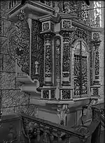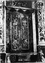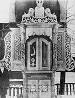 A narrow extension to the west was the same height as the whole building and led to the vestibule. The men's prayer room had two rectangular windows on three sides to the north, east and south; the two floors of the vestibule and women's room had two smaller windows on each side. The roof was two-tiered with a mansard roof and above it a hipped roof that merged into a gable roof. The narrow extension to the west had a gable roof. During the alterations and renovations after the First World War, the rectangular windows were replaced by arched windows and the extension in the west was demolished and a portico with a gable roof was built in its place. The walls were (mainly) decorated with floral ornaments. The bima was a simple table covered with a tablecloth. There were fixed rows of seats for the assembled. The Torah shrine consisted of four levels that tapered towards the top and were framed by columns. The Torah scrolls themselves were on the second level behind a carved folding door. Above were the tablets of the law. Among them was a saying from the Talmud. This was very unusual as the Karaites only refer to the Torah and reject the Talmud. The Torah shrine was probably made by a member of Rabbinic Judaism, as their own community was too small to find a skilled craftsman.[35] |
