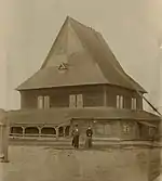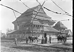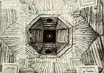 1770[15] - 1913[20] | The layered, pitched roof visible in surviving exterior photographs conceals a series of massive trusses from which the great dome was suspended.[21] The roof, which features three well-defined stages, was considered one of the most architecturally complex and interesting of wooden synagogue roofs.[22] The synagogue was enlarged in the nineteenth century by the addition of one story extensions on each side for the use of the women of the community.[23] | ![]() |