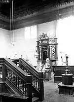 The main hall had two twin windows on each of the three outer sides; the rest of the rooms had smaller, rectangular windows. The ceiling of the main hall had a vault that reached into the roof structure. The bima had the shape of an octagonal, baroque arbor with high wooden columns and was surrounded by a balustrade. The Torah shrine was two-tiered with an attachment that protruded into the vault. It narrowed towards the top and pillars on the sides were decorated with floral motifs. |