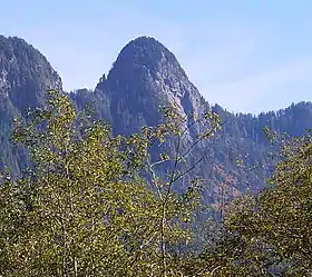 The history of the formation of the Cascade Mountains dates back millions of years ago to the late Eocene Epoch.[4] During the Pleistocene period dating back over two million years ago, glaciation advancing and retreating repeatedly scoured the landscape leaving deposits of rock debris.[4] The last glacial retreat in the area began about 14,000 years ago and was north of the Canada–US border by 10,000 years ago.[4] The U-shaped cross section of the river valleys are a result of that recent glaciation. Uplift and faulting in combination with glaciation have been the dominant processes which have created the tall peaks and deep valleys of the Cascade Range.