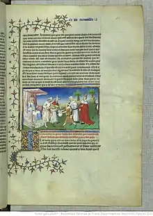Later, in 1413, John the Fearless gifted the manuscript to his uncle John, Duke of Berry, whose coat of arms appears on Folios 1, 97, 136v, 226, and 268. Inventories in 1413 and 1416 of the Duke of Berry's personal library confirm that the manuscript remained in his possession until his death.[1]