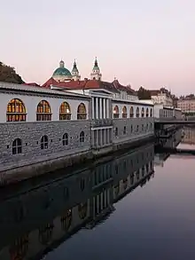 ![]() Plečnik's market building at the Ljubljana Central Market from the Dragon Bridge | |