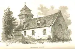 - Old Church and Graveyard. The former church of St Tysul stood on the hillside overlooking the village. Now only a stone porch with an 18th-century doorway remains, standing in the churchyard. The single-chambered medieval parish church is shown in a woodcut illustration[38] to have been extensively rebuilt in the 18th century with round arched windows and roof dormers. It had also the most elaborate of the Montgomeryshire timber west bell-towers — a tower which was enclosed by an open gallery, corbelled out from the supporting framework, built inside the nave. Lych Gate to the graveyard by the architect Harold Hughes, of Bangor 1907.[39]
