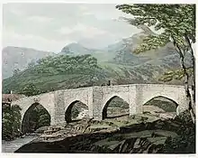 There has been a bridge across the Dee at Llangollen since at least 1284,[2] though the current bridge appears to date to the 16th or 17th century when an earlier bridge was rebuilt.[2][3] The current bridge has been enlarged numerous times since then, doubling in width. The bridge is still in use.