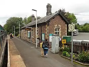 The main buildings on the northbound platform still stand and whilst the station is now unstaffed (tickets must be bought on the train), a waiting room is not available within this building, a shelter near the main building is available. The main building is now run by Llanwrtyd Wells Community Transport (LWCT)(https://lwct.org.uk/), who use it as a Community Centre and meeting rooms. A public phone and customer help point is available on this side, whilst the southbound platform has a waiting shelter only. Digital information screens and timetable posters provide train running details. Step-free access is available to both platforms, though the southbound one requires the use of a steeply inclined ramp.[3]