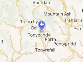 The facility has its origins an old subsidiary workhouse which was completed in 1903.[1] An infirmary was added in 1909 and it became a general hospital in 1927[2] before joining the National Health Service as Llwynypia Hospital in 1948.[1] As the only village with maternity facilities in the Rhondda, most residents from the area over the last century have Llwynypia as their place of birth on their birth certificates.[3] After services transferred to the new Ysbyty Cwm Rhondda, Llwynypia Hospital closed in January 2010.[4]