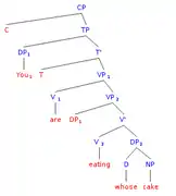 In wh-movement in English, an interrogative sentence is formed by moving the wh-word (determiner phrase, preposition phrase, or adverb phrase) to the specifier position of the complementizer phrase. This results in the movement of the wh-phrase into the initial position of the clause.[1] This is seen in English word order of questions, which show Wh components as sentence initial, though in the underlying structure, this is not so.