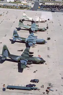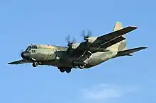 In the Indo-Pakistani War of 1965, the No. 6 Transport Squadron of the Pakistan Air Force modified its C-130Bs for use as bombers to carry up to 20,000 lb (9,072 kg) of bombs on pallets. These improvised bombers were used to hit Indian targets such as bridges, heavy artillery positions, tank formations, and troop concentrations.[41][42][43] Some C-130s flew with anti-aircraft guns fitted on their ramp and apparently shot down some 17 aircraft and damaging 16 others.[44]