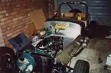 The original Locust kit was based on the Triumph Spitfire or Herald chassis to give the finished vehicle the look of a Lotus 7, this was quickly superseded by a all new Locust using its own developed chassis with the choice of using a Triumph Spitfire or MK1/MK2 Ford Escort for the donor vehicle parts to complete the car. The original design was by John Cowperthwaite and it was sold as the JC Locust by J.C. Auto Patterns.[1] The Locust used a ladder frame and a body constructed from three 8 ft by 4 ft sheets of 3/4" thick exterior grade or marine plywood alternatively MDF sheets. Once complete, the body tub is skinned with aluminium sheet.