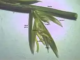 The spikelets bear up to twelve florets, mostly with a single glume, with only the terminal floret having two. The glumes are up to three-quarters the length of the spikelet; their outer surface is finely ribbed with longitudinal veins. There is no awn, the lemma is oblong and has five nerves and the palea is a similar shape with two nerve and a few fine hairs. The three anthers are yellow.[2]