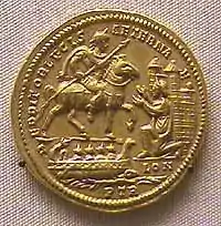 In 286, the emperor Maximian issued a death sentence against Carausius, admiral of the Roman navy's Britannic fleet (Classis Britannica), on charges of having abetted Frankish and Saxon piracy and of having embezzled recovered treasure. Carausius responded by consolidating his allies and territory and revolting. After fending off Maximian's first assault in 288, he declared a new Britannic Empire and issued coins to that effect. Constantius Chlorus's sack of his Gallic base at Gesoriacum (Boulogne), however, led his treasurer Allectus to assassinate and replace him. In 296, Chlorus mounted an invasion of Britain that prompted Allectus's Frankish mercenaries to sack Londinium. They were only stopped by the arrival of a flotilla of Roman warships on the Thames, which slaughtered the survivors.[95] The event was commemorated by the golden Arras Medallion, Chlorus on one side and, on the other, a woman kneeling at the city wall welcoming a mounted Roman soldier.[96] Another memorial to the return of Londinium to Roman control was the construction of a new set of forum baths around the year 300. The structures were modest enough that they were previously identified as parts of the forum and market but are now recognised as elaborate and luxurious baths including a frigidarium with two southern pools and an eastern swimming pool.