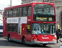 When re-tendered, route 13 was retained by London Sovereign with a new contract commencing on 31 August 2013. Wright Eclipse Gemini 2 bodied Volvo B5LHs were introduced on the same date.[9][10] In March 2015, Transport for London opened a public consultation on proposals to scrap the route.[11][12] The route was saved after intervention by Mayor of London Boris Johnson.[13][14] In September 2016, six Wright SRM bodied Volvo B5LHs entered service on the route.[15][16][17] In July 2016, under the tenure of new Mayor of London Sadiq Khan, TfL opened another consultation on proposals to extend the route to North Finchley and divert it to Victoria station replacing route 82.[18][19][20] This took effect on 1 April 2017 with it now being operated by Tower Transit and becoming a 24-hour route.[21][22]
