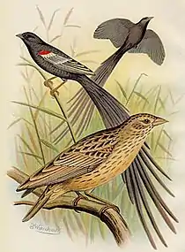 The long-tailed widowbird (Euplectes progne), also known as the "Sakabula", is a species of bird in the family Ploceidae.[2] The species are found in Angola, Botswana, the DRCongo, Kenya, Lesotho, South Africa, Eswatini, and Zambia.[3] The long-tailed widowbird is a medium-sized bird and one of the most common in the territories it inhabits.[4] Adult breeding males are almost entirely black with orange and white shoulders (epaulets), long, wide tails, and a bluish white bill.[2] Females are rather inconspicuous, their feathers streaked tawny and black with pale patches on the chest, breast and back, narrow tail feathers, and horn-colored bills.[2]