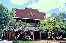 The former QATB centre is a two-storey timber-framed building with a corrugated iron roof. and has wide surrounding verandahs to both levels. The front of the building is clad with pressed metal sheeting which simulates bricks and stone quoins. This effect is heightened by appropriate painting. The sheeting is continued up into a parapet which conceals the roof from the street and carries the QATB Maltese cross insignia and the date 1921. The remainder of the building has exposed studs and a timber lining. The verandah to the upper floor has dowel balustrading and panels of lattice at the front corners and at the rear. There is a timber valance of vertical boards cut to form shallow arches between the timber post which support the verandah.[1]