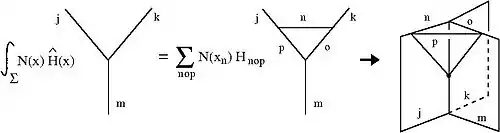 This then naturally gives rise to the two-complex (a combinatorial set of faces that join along edges, which in turn join on vertices) underlying the spin foam description; we evolve forward an initial spin network sweeping out a surface, the action of the Hamiltonian constraint operator is to produce a new planar surface starting at the vertex. We are able to use the action of the Hamiltonian constraint on the vertex of a spin network state to associate an amplitude to each "interaction" (in analogy to Feynman diagrams). See figure below. This opens up a way of trying to directly link canonical LQG to a path integral description. Now just as a spin networks describe quantum space, each configuration contributing to these path integrals, or sums over history, describe 'quantum space-time'. Because of their resemblance to soap foams and the way they are labeled John Baez gave these 'quantum space-times' the name 'spin foams'.