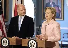 Prime Minister Cameron's first appointment was Hague as Secretary of State for Foreign and Commonwealth Affairs. He was also accorded the honorary title of First Secretary of State.[36] In his first overseas visit as British Foreign Secretary, Hague met US Secretary of State, Hillary Clinton, at Washington[37]
