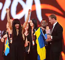 Lorine Zineb Nora Talhaoui, known professionally as Loreen (IPA: [lɔˈreːn]; born 16 October 1983)[3][4] is a Swedish multi-genre singer, songwriter and record producer.[5][6] Representing Sweden, she won the Eurovision Song Contest 2012 in Baku, with her entry "Euphoria". The song reached number one in many European countries, including Germany and Sweden.