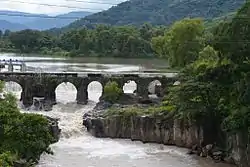 A bridge was built over this river during the Spanish Colony, thanks to the initiative of Baltazar de Orena[Note 1] from Valle Town Hall and governor Pedro Mayen de la Rueda, who proposed its construction in 1579. The bridge was completed in 1592 under the director of architects Francisco Tirado and Diego Felipe.[4] Years later, some repair were needed, and criollo poet and leader Francisco Antonio de Fuentes y Guzmán was in charge of the work.[4][Note 2]