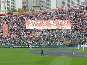 The Giants are the most popular team in the Korea Baseball Organization league.[9] According to a Gallup Korea's survey conducted in 2011, the Giants were chosen as the most popular team three times in a row.[9] They attracted over 1 million fans to Sajik Baseball Stadium in 1991 for the first time in league history. In the 2009 season, they set the all-time record of home attendance of 1,380,018 fans.[2] In the 2011 season, they also led the league in the total home attendance with 1,358,322 fans at 67 home games.[10] The average attendance was 20,273 fans per game, meaning the stadium was 71% full on average per game.[10] From 2008 to 2011, they drew over 1 million fans for four consecutive years.