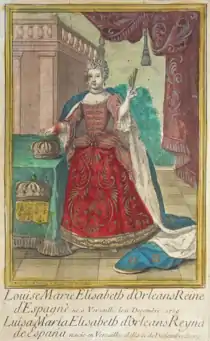 Louise Élisabeth d'Orléans (Spanish: Luisa Isabel; 9 December 1709 – 16 June 1742) was Queen of Spain as the wife of King Luis Felipe I. Their reign is regarded as one of the shortest in history, lasting for seven months. Louise Élisabeth was the fourth daughter to survive to adulthood born to Philippe II, Duke of Orléans and Françoise Marie de Bourbon.