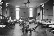 The new yellow-brick building with slate roofs echoed the construction materials used by its larger neighbour, the Cambridge Military Hospital. It cost £12,600 to build[3] and had "sanitary blocks" incorporated in "Italianate" corner towers towards the back.[4] There were fifty-three beds arranged in eleven wards of different sizes, including wards named for Queen Victoria, the Duke of Connaught and Lord Lansdowne. The staircases had shallow steps, supposed to help nurses in long dresses run up and down.[5] A "fine" tiled operating theatre was added in 1908 and officially opened by the Duchess in 1909. It had a new sort of "brilliant light" and Doulton basins and sinks "fitted with the latest kind of mixing valves for hot and cold water with elbow-action and sprays".[6] Within a couple of years the hospital was treating around 1000 cases annually: about half in its General Division and half in its Maternity Division which had twenty-five "swing cots" along with twenty-five beds.[6]