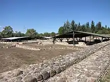 The excavation work was conducted by the Ephorate of Byzantine Antiquities, Thessaloniki.[2] They started in 1993, ended in 1997 and were financed by the Greek railway company OSE.[3] The railway line divides the excavation site diagonally. The western defense tower and part of the wall are outside the accessible terrain.[4]