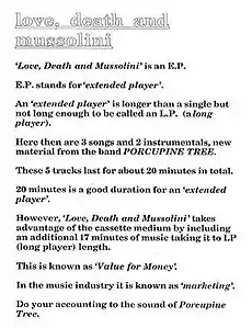 The Love, Death & Mussolini E.P. was a cassette released by Steven Wilson under the pseudonym of Porcupine Tree, issued by No Man's Land in early 1990, and was limited to only 10 copies.