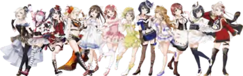 In October 2017, Aqours from Love Live! Sunshine!! were announced to join the arcade game.[26] They first appeared for a limited time from December 6, 2017, until January 8, 2018, as a preliminary trial as part of the game's 1st anniversary campaign.[27]