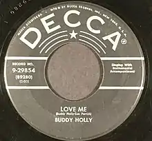 Love Me is the debut single of Buddy Holly. It was released on April 16, 1956, on the Decca Label, backed by "Blue Days - Black Nights". The single was the result of Holly's first recording session at Bradley's Barn in Nashville. Due to creative differences, the song represented a more country sound than Holly liked and, paired with lack of promotion, was a commercial failure.