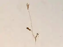 Lovenella gracilis are colonial animals that form erect colonies,[1] on hard surfaces using a hydrorhiza, stem-like structure, and reach a maximum height of around 2.3 mm.[2] The polyp is the dominant stage of the L. gracilis. They are trophosome with thin hydrocaulus that brach out alternatively to form the hydrotheca. At the end of each branch there is a conical operculum that consists of eight pieces. This structure also contains ten to twelve tentacles equipped with nematocysts that can be used in self-defense or to capture their prey.[3]