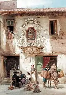 Passini was taught art first by his father, and later studied at the Vienna Academy of Art under the painters Joseph von Führich and Leopold Kupelwieser.[1][2] In the 1850s, Passini settled in Venice, where he worked in the studio of Carl Werner. He had previously studied under Werner at Leipzig,[1] and he accompanied Werner on his painting tour of Italy.[2][3] The fellow artist Anton Romako was also part of Werner's studio. Between 1853 and 1870 Passini lived in Rome, where his work became focused on the human figure set against architectural and interior elements, and within narrative themes. From 1873, and for the rest of his life, he remained in Venice – though with occasional visits to Berlin – where his watercolours often featured everyday Venetian life, ordinary people, and portraiture.[4]