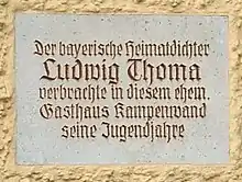 In 1876, his mother rented the pub Zur Kampenwand in Prien am Chiemsee, which she managed together with Viktoria Pröbstl and her daughters.[10] Ludwig began a period of alternating between boarding school and holidaying in his family's "idyllic home", as he calls it in Lausbubengeschichten ("Tales of a Rascal"). Misdemeanours and conflicts with teachers there are probably based on real experiences: "There is sufficient evidence that Thoma condensed these altercations for his stories, but by no means invented them."[11] In 1877, he moved to the boarding school of the study seminar in Neuburg an der Donau. He had to repeat a year at the study centre in Burghausen.[9] Here Georg Pauliebl was one of his friends; his life story was described by Thoma in the story Der heilige Hies ("Saint Hies").[12]