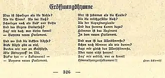 In the last 14 months of his life Thoma wrote for the Miesbacher Anzeiger - often through an editorial on the first page[37] - 175 mostly (except for five cases) anonymous and mostly anti-Semitic articles, especially against the government in Berlin and social democracy. But he also wrote about the Jewish bourgeoisie, for example: "Teiteles Cohn and Isidor Veigelduft, they are still allowed to put their ornate knuckles in their leather cases in summer, with Rebekka on her arm in a dirndl dress, smelling of violets and garlic."[38] He described the Reich capital of Berlin as a "duck dump" and a "combination of a Galician Jewish nest and New York criminal district", described in the language of the Völkisch movement of an "idiosyncracy deeply rooted in race ..." and insulted the Weimar Republic as "characterless idiocy".[39] He called its representative "this sad herd of pigs from Tarnopol and Jaroslau" and emphasized that "besides the Hymie from Promenadenstrasse, we also have shot down several from the tribe of Levi shot down …" (the Bavarian Prime Minister Kurt Eisner was shot dead in Promenadenstrasse). He called Eisner himself a "Jewish pig", whose murder he described as an "execution".[40]