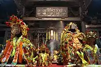 The Meizhou Kaiji Er Ma, allegedly brought to Lukang by Shi Lang[4] or by Lan Li and a monk from Meizhou, is known as the Dark-Faced Mazu (Heimian Ma) from the coloration produced by offerings of incense over its years of veneration. It is now usually kept in a separate hall.[13] This statue was almost stolen from Lukang's faithful when they took it with them on a pilgrimage to the mainland at the end of the Qing. Prior to the 1922 pilgrimage, the temple president commissioned the Quanzhou carver Lian Yong-chua to produce another similar statue for use on such trips. This is now known as the Jinxiang Ma and is placed in the Main Hall except on occasions when the Meizhou Mazu is brought into that room.[13]