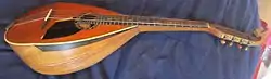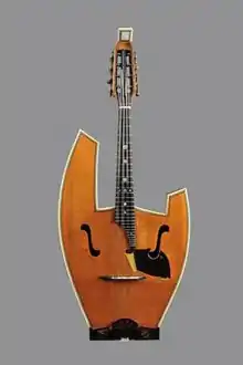 In the 1890s he collaborated with the Mandolin virtuoso G. B. Maldura, creating a series of concert mandolins for mandolin orchestras including two mandolin types, a mandoliola (also called Octave mandola) and a mandoloncello, all suited for playing string quartet pieces for mandolin. They were first displayed in Turin in 1898, and soon became came to set the standard measures for mandolin orchestras.[5][6] Embergher made instruments from approximately 1880 through 1935. He is considered to have taken Rome's standard of building mandolins, exemplified by luthiers Giovanni De Santis and Giovanni Battista Maldura, and improved upon it. His instruments became known for their "strong, sonorous warm sound and a perfect intonation."[2] Among improvements he made was to change the way the instrument sounded making alterations to the sound board and sound chamber. He also added a zero-fret, an extension of the fingerboard under the 2nd string up to the g, and a highly pronounced 'V'-shape in the cross-section of the neck. Instruments from his atelier were considered "the finest instruments" and demand for them rose until he was employing 15 luthiers in his workshop and exporting to other countries.[2]