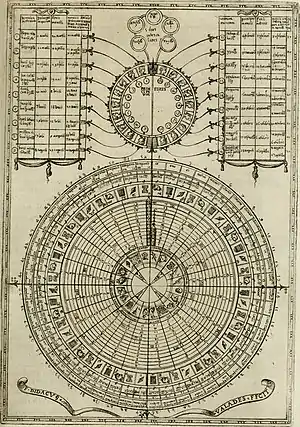 Llull's works appeared increasingly in print in the course of the sixteenth century. Lefèvre in France and Cardinal Cisneros in Spain embarked on projects to publish Llull's works. Bernard de Lavinheta and Charles Bovelles continued editing and publishing Lullian texts with humanist printers such as Jodocus Badius. Lavinheta also published his own Lullist-encyclopaedist work, notably the Explanatio compendiosaque applicatio artis Raymundi Lulli which explains how the Art is the introduction to all faculties: physics, mathematics, metaphysics, theology, ethics, medicine, and law.[13] The seventeenth century, however, brought other approaches to systematic knowledge by Petrus Ramus and Descartes.[14] Encyclopaedists such as Johann Heinrich Alsted wrote commentaries critically comparing the logics of Aristotle, Ramus, and Llull.[15] It was in this milieu that Gottfried Wilhelm Leibniz probably became familiar with Llull. In 1666 Leibniz wrote the De arte combinatoria with the idea that all concepts can be generated through a combinatorial system.[16]