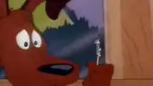 Bugs dives into the hair on the back of Smidgen's neck. From there, Bugs proceeds to scratch the surface of Smidgen's skin, causing the dog to writhe in ecstasy. This gives Bugs the opportunity to run down Smidgen's leg and leave the cabin. Smidgen runs out after him.
