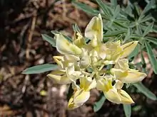 Lupinus angustiflorus is a species of lupine known by the common name narrowflower lupine. It is endemic to California, where it grows in the volcanic soils of the northeastern mountains and Modoc Plateau. It is an erect perennial herb sometimes exceeding one meter in height. Each palmate leaf is made up of 6 to 9 leaflets each up to 6 centimeters long. The inflorescence is up to 34 centimeters long, bearing many flowers each roughly a centimeter long. The flower is cream to pale yellow-orange with a patch of deeper yellow or orange on its banner. The keeled lower petals may be tipped with lavender. The fruit is a hairy legume pod up to 4 centimeters long.