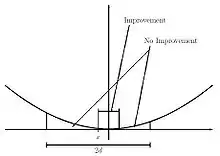 At each step, the LJ heuristic maintains a box from which it samples points randomly, using a uniform distribution on the box. For a unimodal function, the probability of reducing the objective function decreases as the box approach a minimum. The picture displays a one-dimensional example.