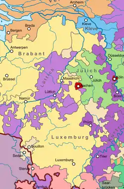 The first campaign did not result in territorial gains, but did do damage to the Luxemburgish countryside,[4] and successfully managed to distract the Spanish army.[3] Two years later, a similar campaign to Luxemburg led to the temporary occupation of Huy in neutral Liège by the Dutch States in February–March 1595, but they were soon expelled and the Duke of Bouillon was also driven away from Luxemburg's border fortresses again.[5][6]