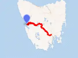 Starting at Granton it winds along the southern side of the Derwent River in a generally north westerly direction to New Norfolk. This section has in the past been susceptible to flooding.[1][2]